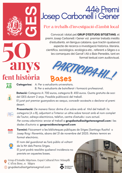 Oberta la convocatòria de la 44a edició del Premi Josep Carbonell i Gener, per a treballs de recerca de joves estudiants en l’àmbit local.